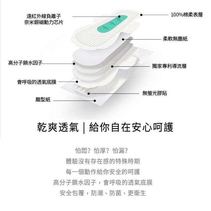 ·主要成分:遠紅外線負離子奈米磁動力芯片、100%棉柔表層、無塵殺菌布、透氣膜、高分子吸水因子等