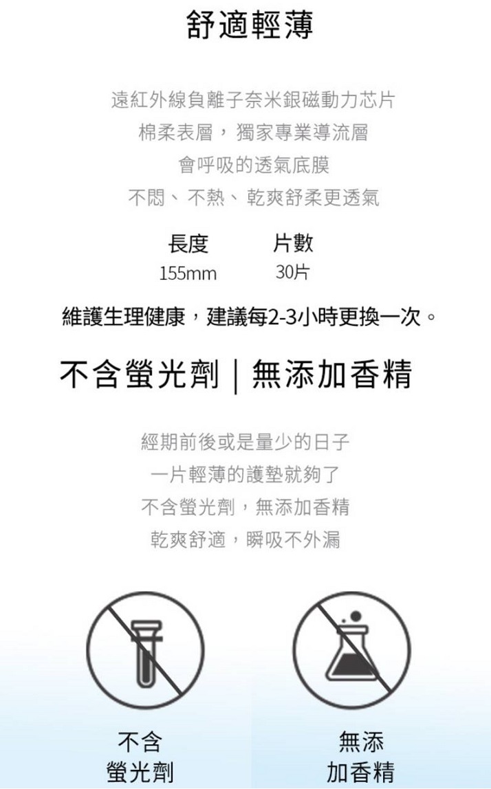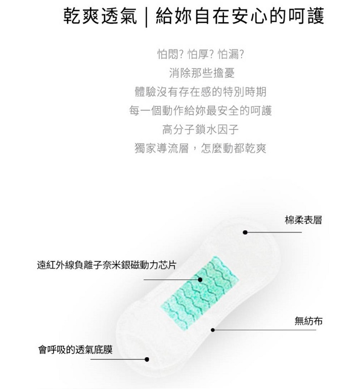 ·主要成分:遠紅外線負離子奈米磁動力芯片、100%棉柔表層、無塵殺菌布、透氣膜、高分子吸水因子等