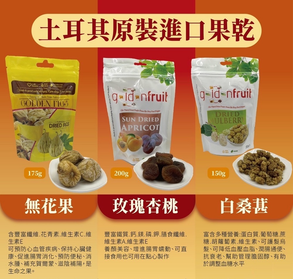 商品規格:無花果乾/玫瑰杏桃果乾/白桑葚果乾